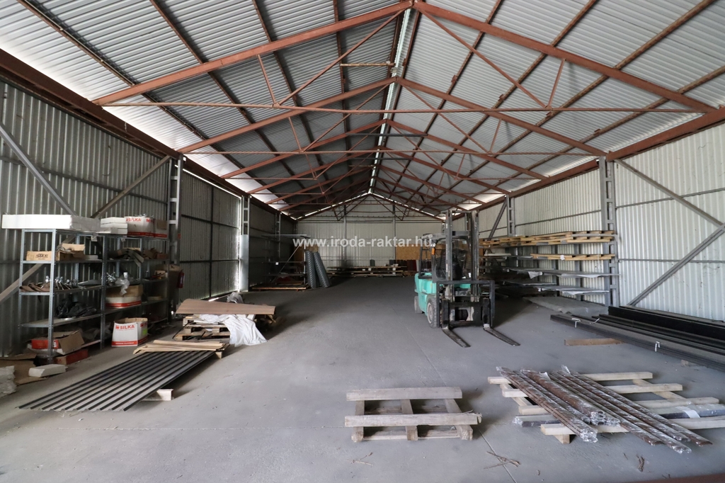 - 200sqm large steel framed storage with metal sheet walls, concrete floor. Internal height: 4.35-6.7m.