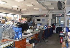 387 sqm heated, high-bay warehouse with 8.3 m internal height, equipped with shelving and 2 × 2.5 m ground-level gate