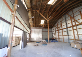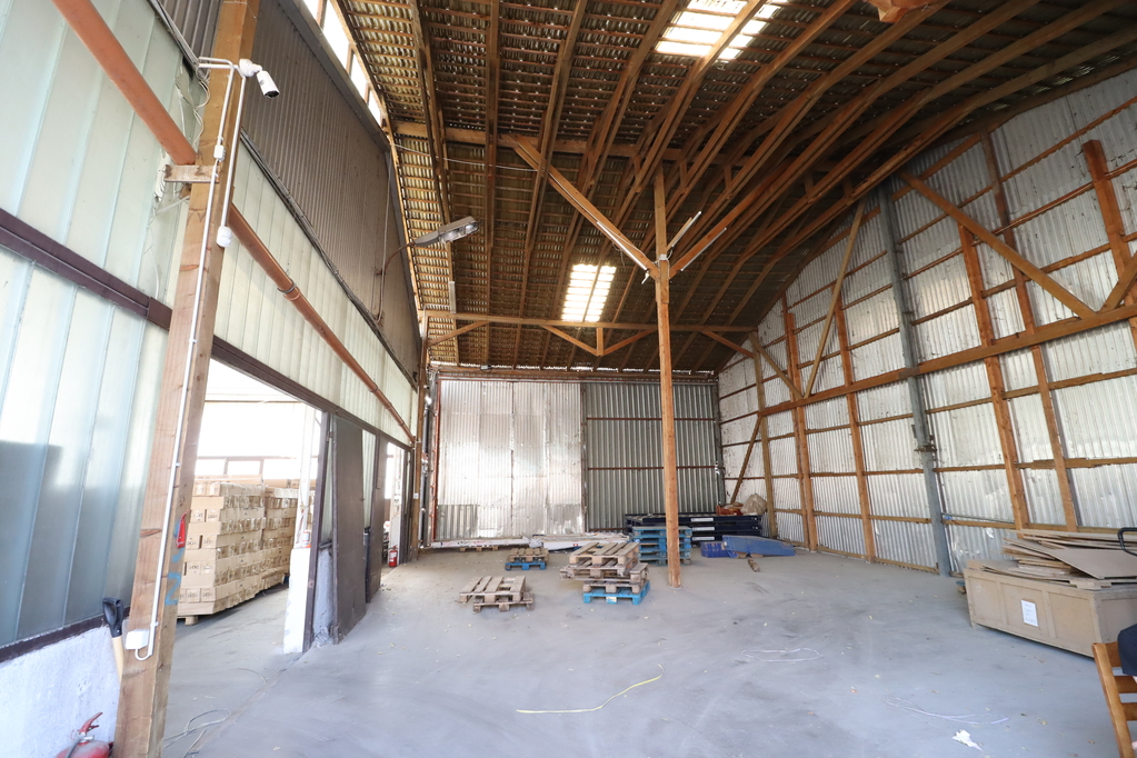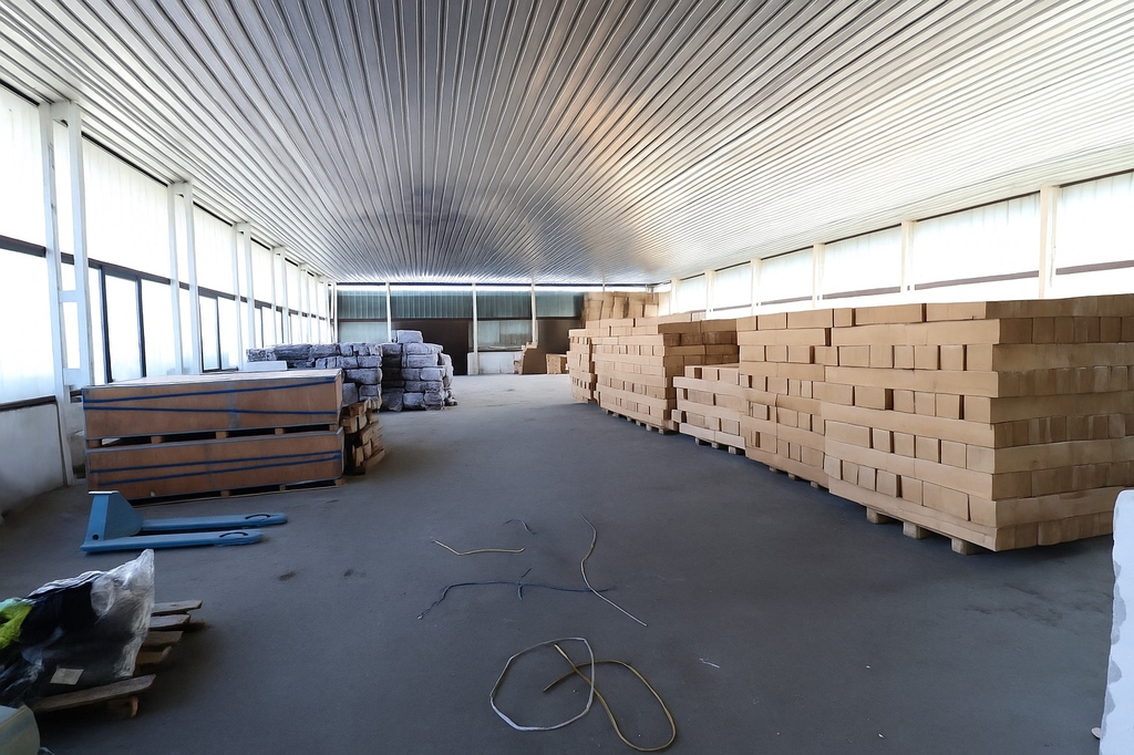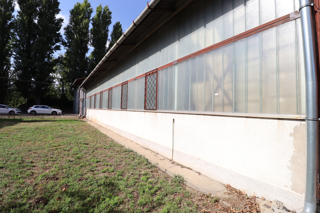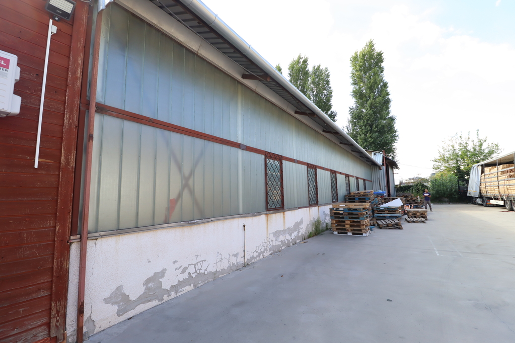The total plot area is 4,118 sqm, fully paved, on which there is a 161 sqm trapezoidal sheet metal warehouse (uninsulated, internal height 5.5–6.9 m) and a 355 sqm warehouse (with copolite glass, unheated, internal height 4.2 m). The two warehouses are interconnected.
