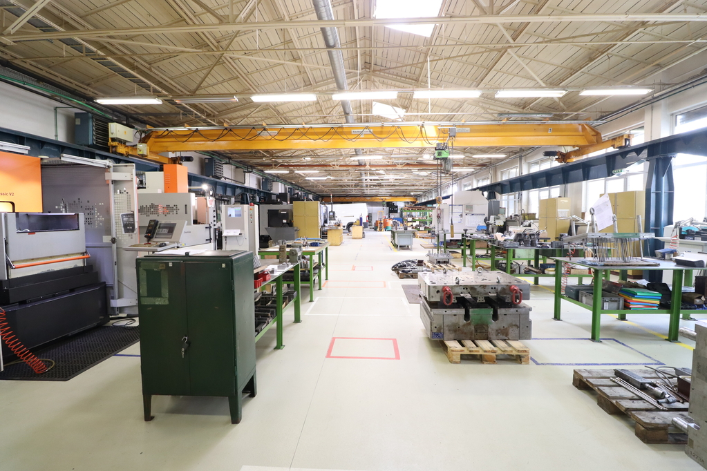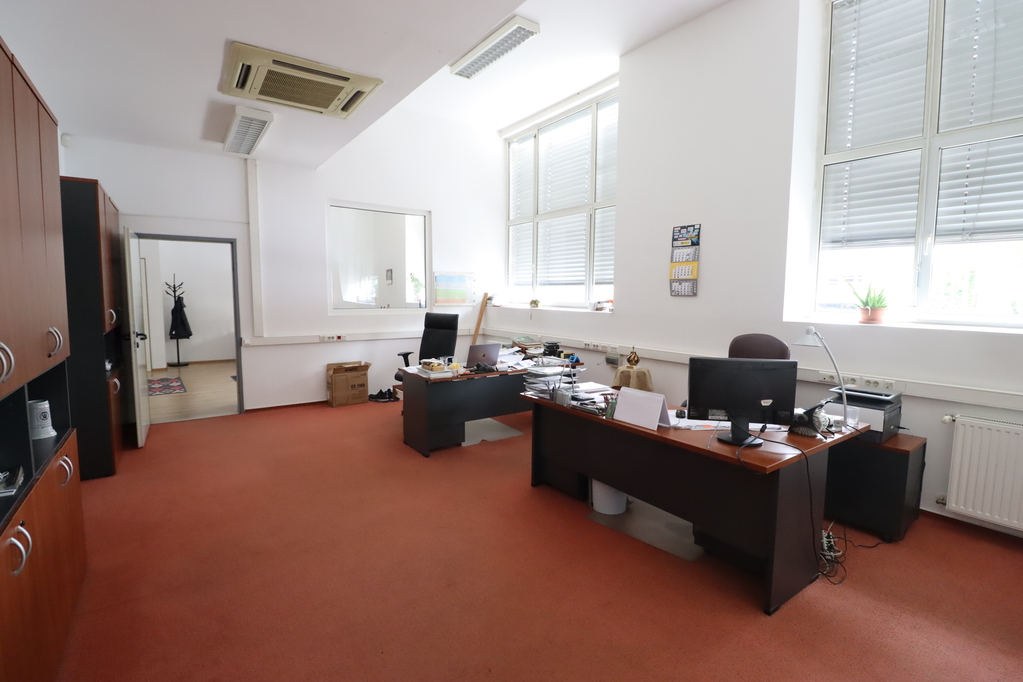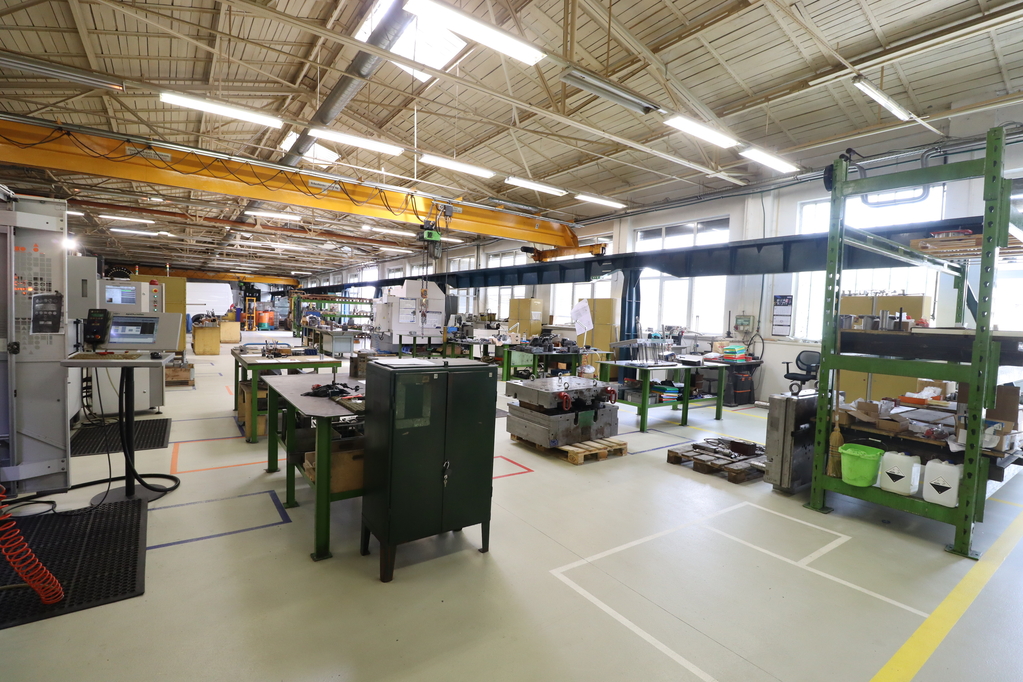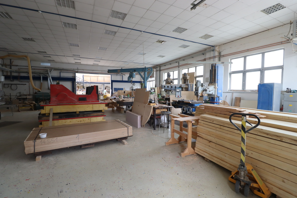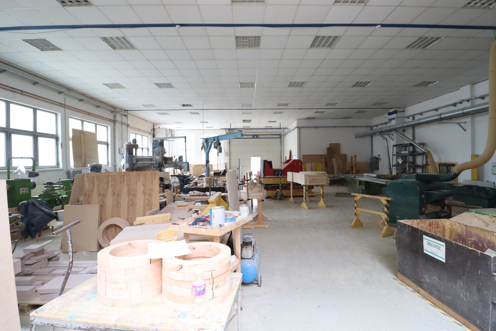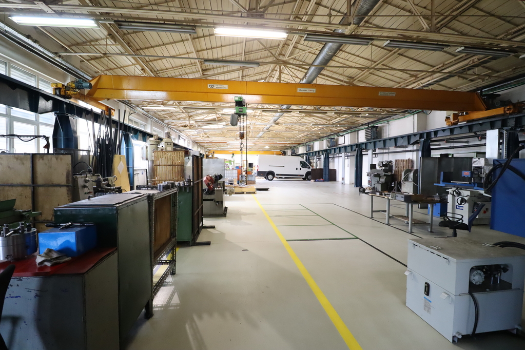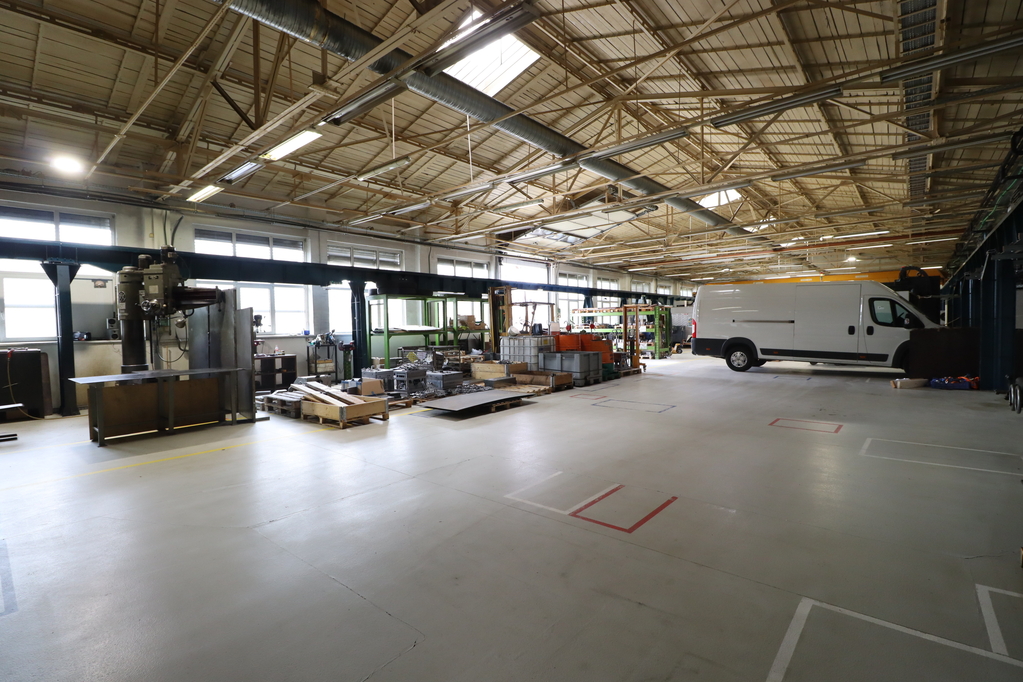 - 980 sqm production hall with resin flooring, a 4.4-5m interior height, and underfloor heating, containing 2 overhead cranes with a capacity of 3.2 tons each. Door size: 3.1*3.9m.