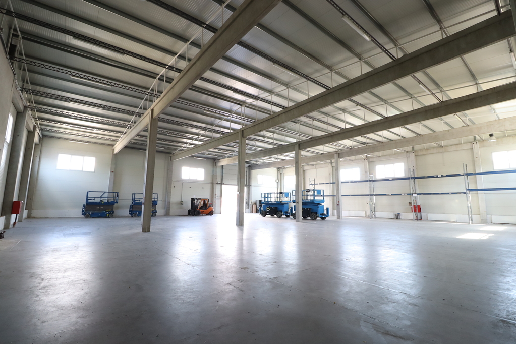 The warehouse, built in 2009, has a reinforced concrete frame, 10 cm insulated sandwich panel roofing, a dust-free industrial concrete floor, a 3.9m x 4m ground-level gate, and an internal clear height of 6.2 meters. It is currently unheated.