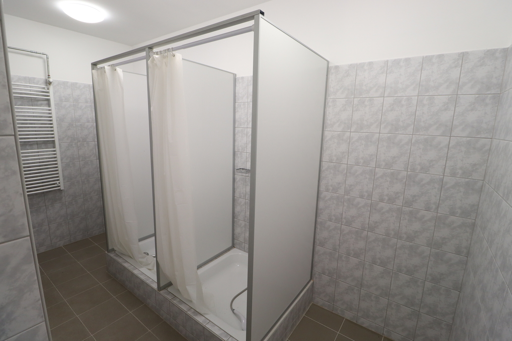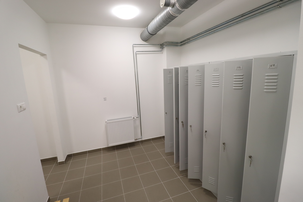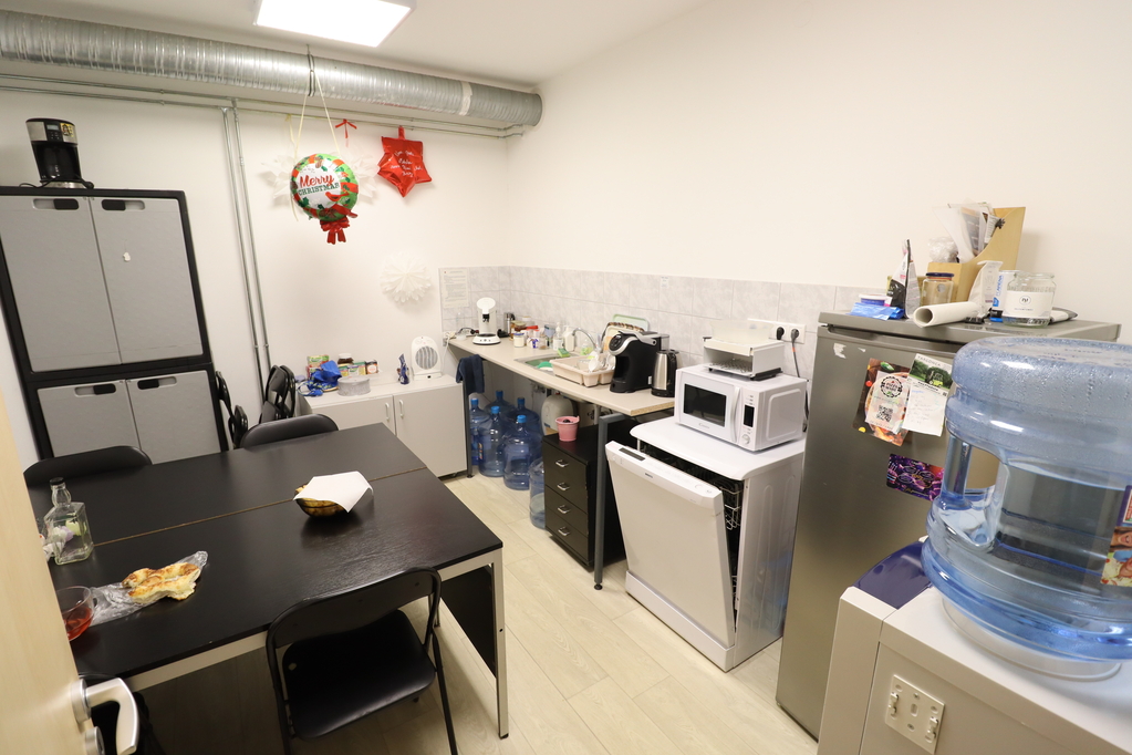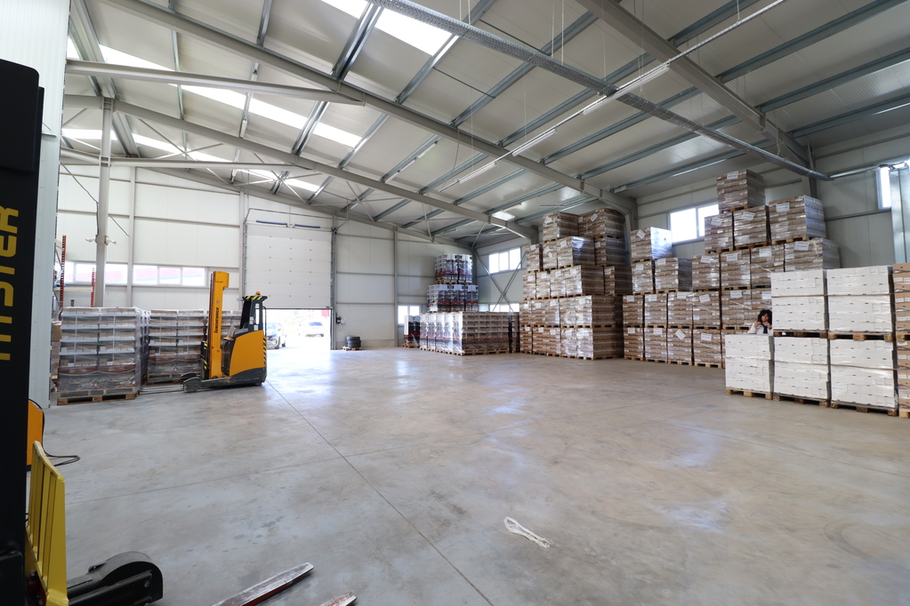The warehouse area is 410 sqm, complemented by a changing room and sanitary facilities, as well as access to a shared kitchen and dining area.