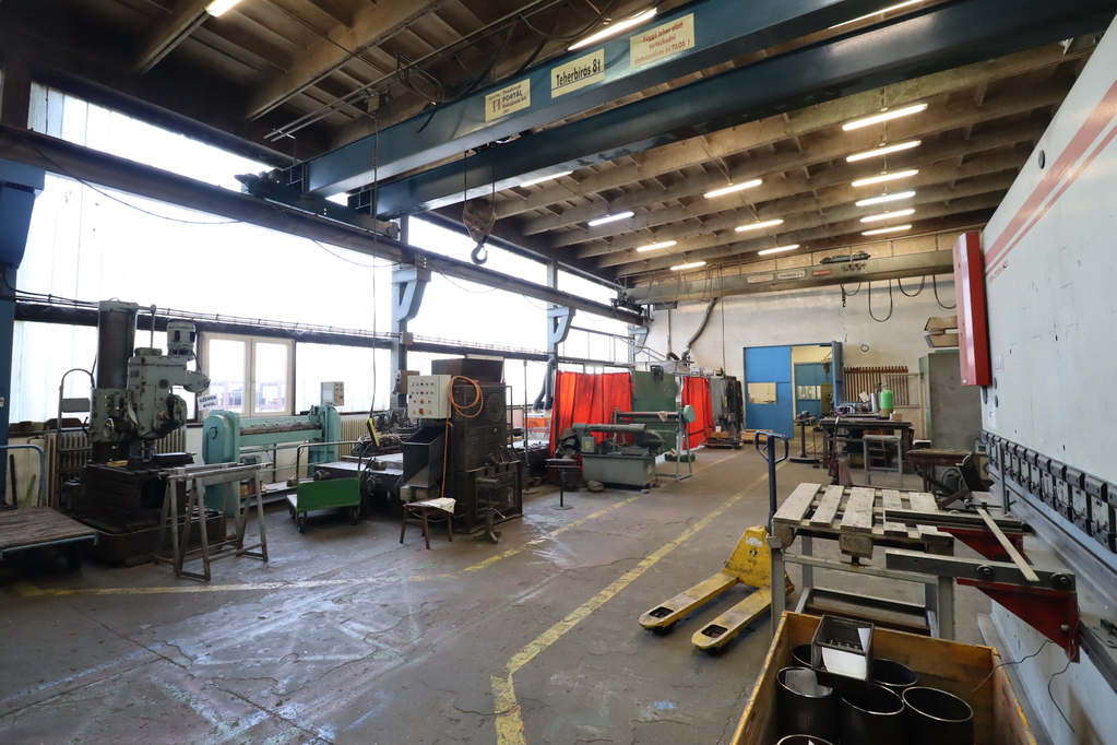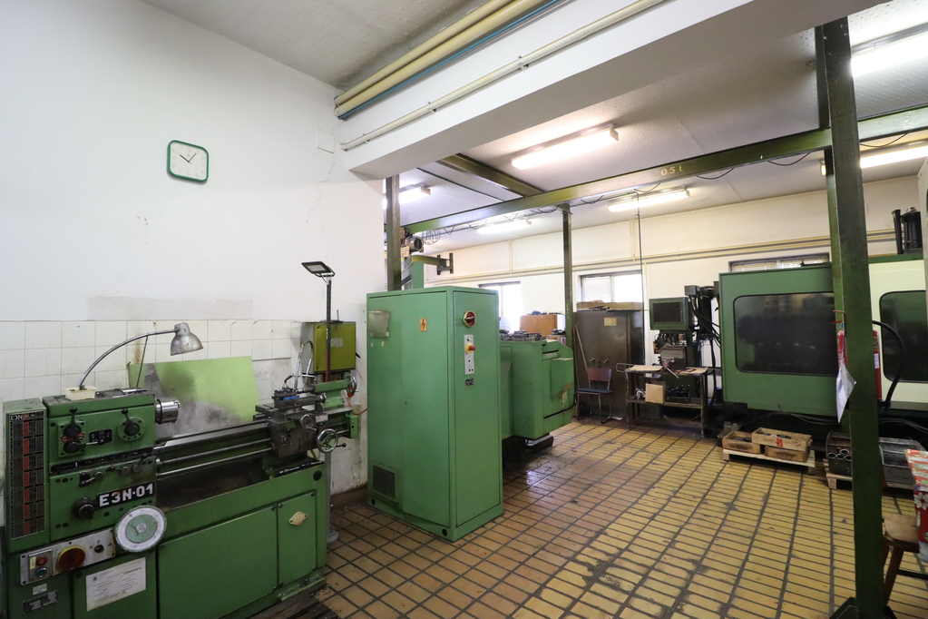 144 sqm heated workshop with 4.8 m internal height, equipped with 0.5-ton and 2-ton overhead cranes, with a 2.5 × 2.5 m gate
